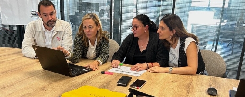 Réunion de travail avec (de g. à d.) Christopher Bonvalet et Virginie Serrières, contrôleurs sécurité à la Carsat Sud-Est, Marie-Danielle Fernandez, animatrice prévention TMS et Flora Donadelli, DAF de SMS.